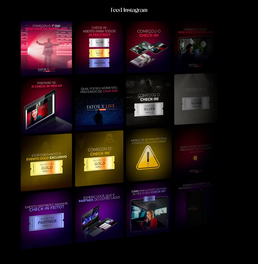 Na divulgação no Instagram, criei criativos focados em retenção, engajamento e conversão, sempre alinhados à identidade visual do lançamento. Cada post funcionava como um ponto estratégico, ativando curiosidade, prova social e escassez para manter a audiência aquecida. A estética reforçava o tom premium da marca, com consistência entre feed, stories e anúncios. O perfil se transformou em uma vitrine ativa do evento, gerando expectativa e reforçando autoridade. Uma presença digital coesa, atrativa e impossível de ignorar.